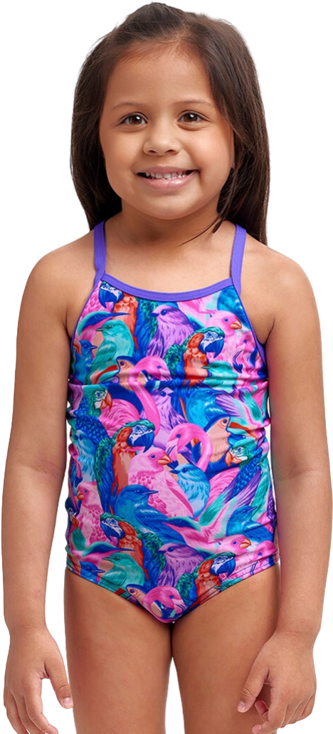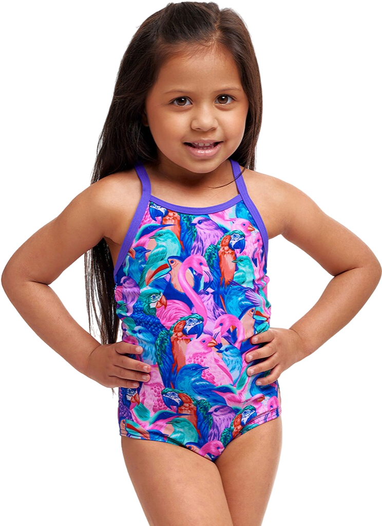 Купальник FUNKITA Toddler Girl's Birds Gone Wild – популярный цельнокроеный купальник для маленьких пловчих, предлагающий комфорт, полное покрытие и яркий дизайн с дикими птицами.